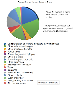 The Foundation for Human Rights in Cuba, or FHRC, reported revenues of $1,370,165 on its 2012 Form 990.  It sent $178,375 to an undisclosed number of Cubans to boost civil society.